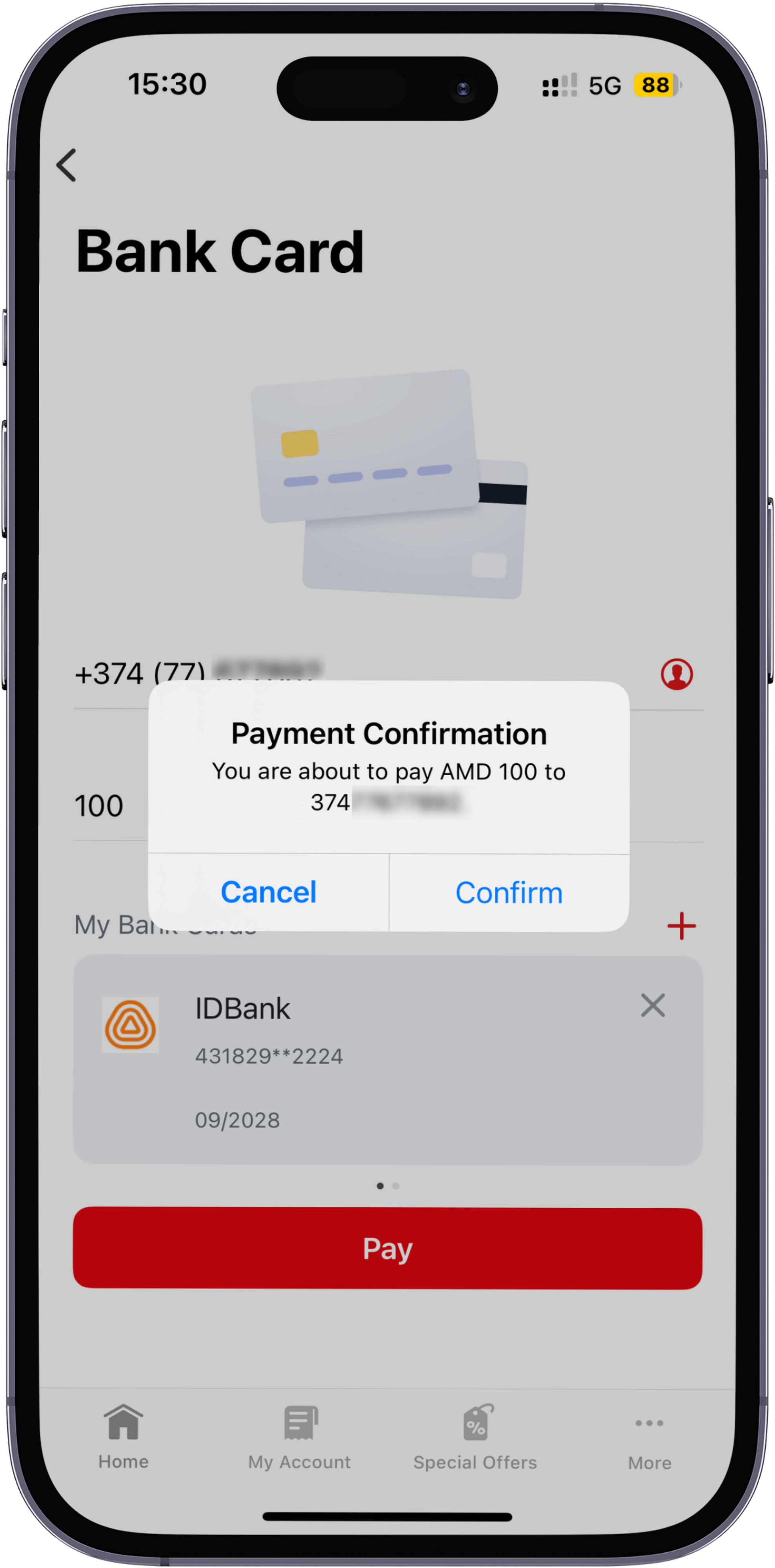 And after attaching a bank card, payments are made within seconds. All you need to do is enter the phone number, amount, select the attached card and click the Pay button. Once the payment is confirmed, the transaction is completed.