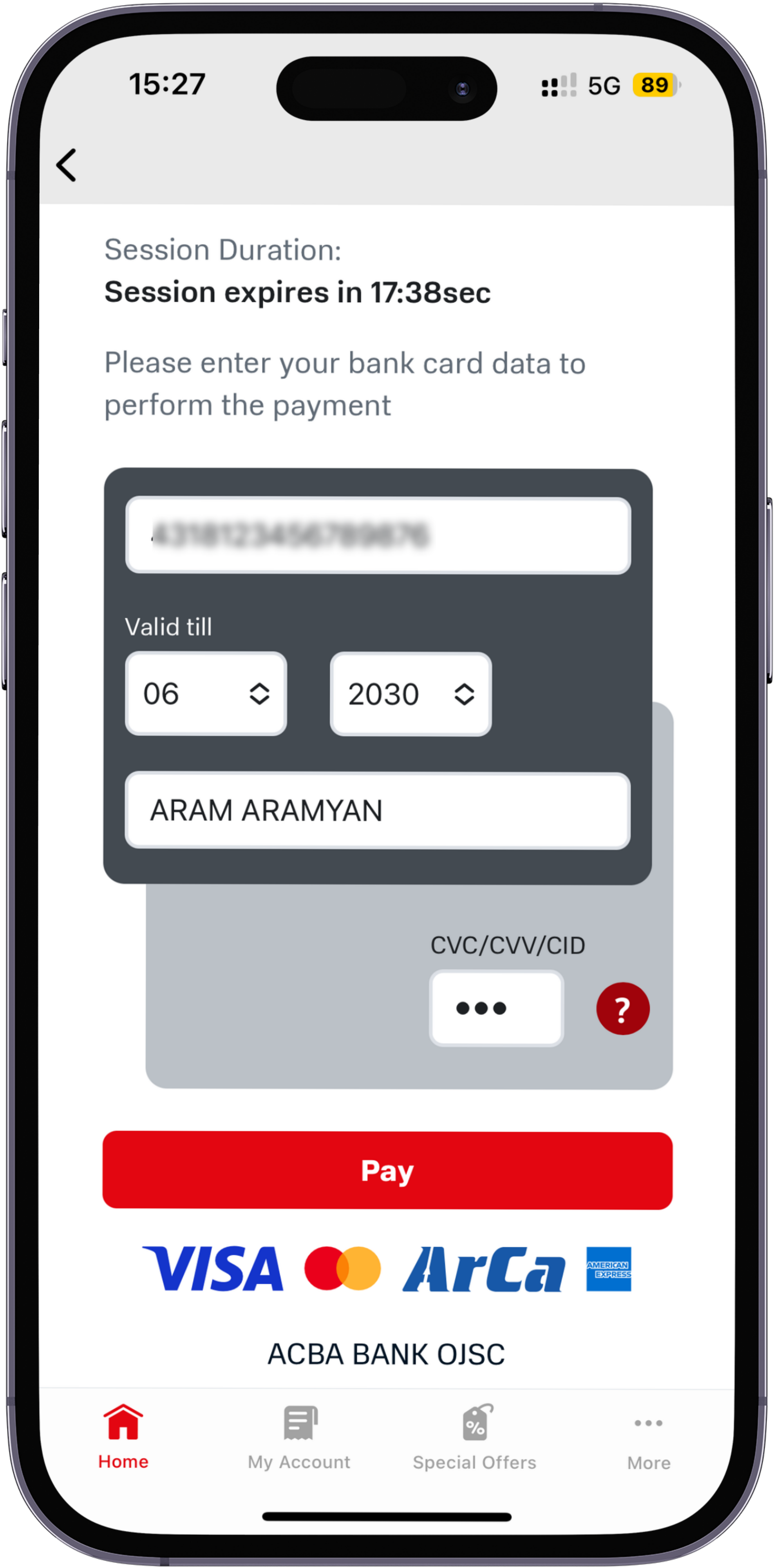 Enter your bank card details and click the Pay button.