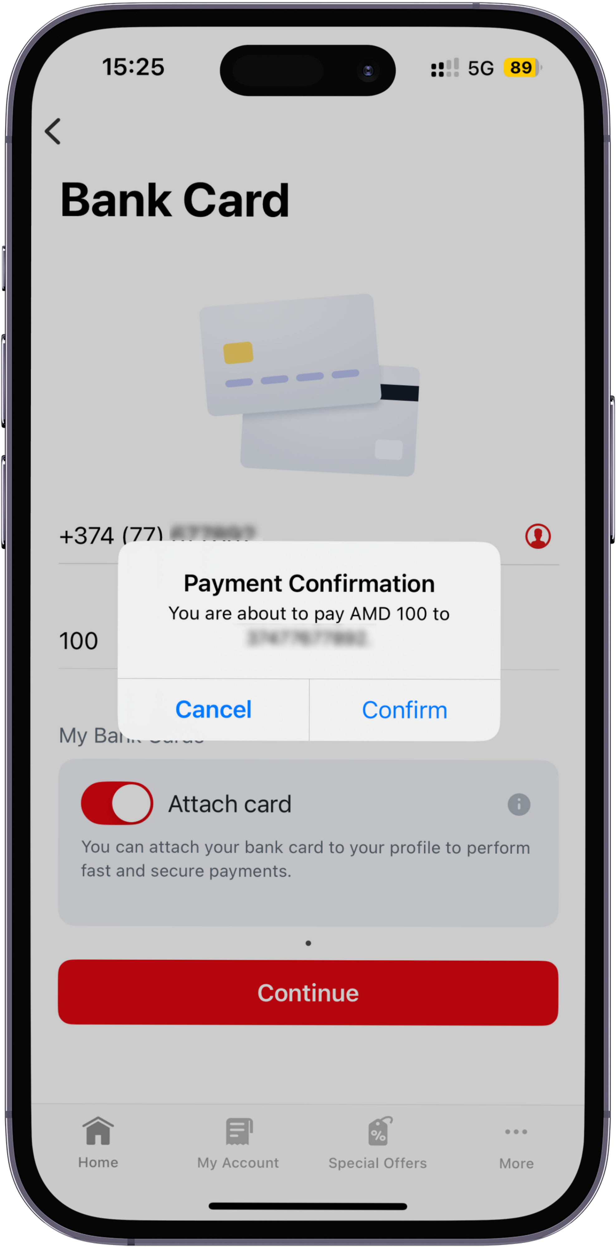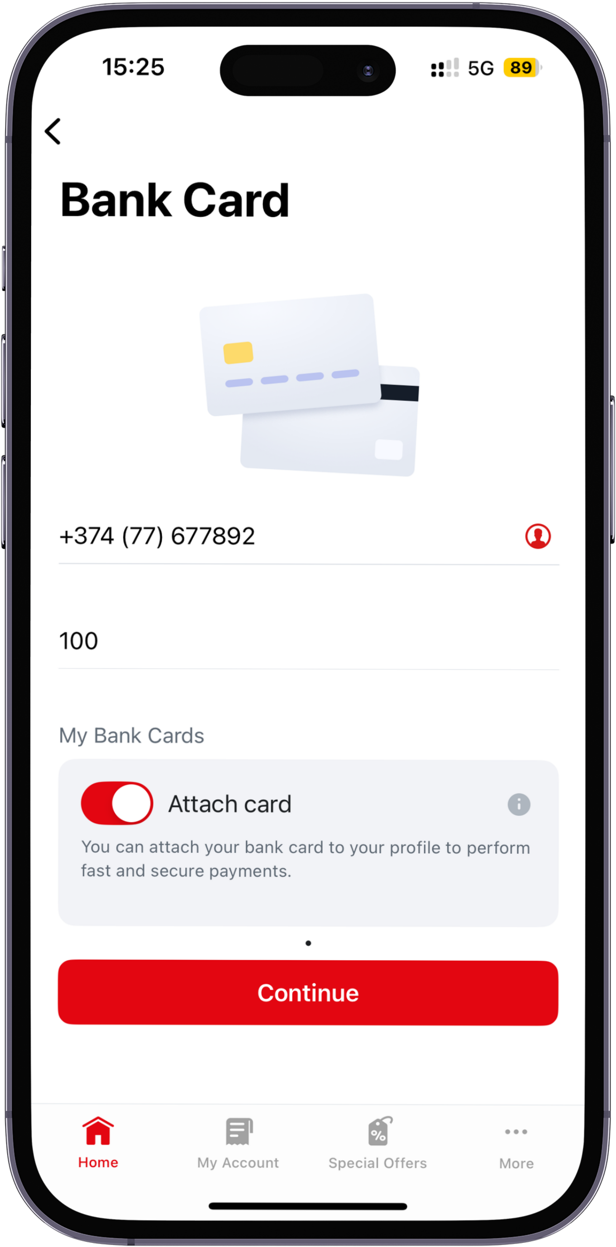 If you want to pay for another Viva phone number, edit the data in the Phone number field and specify the amount. We also recommend activating the Attach card option. In this case, the bank card will be attached to your account and you will be able to make payments in the future with just one click. Then click the Continue button.